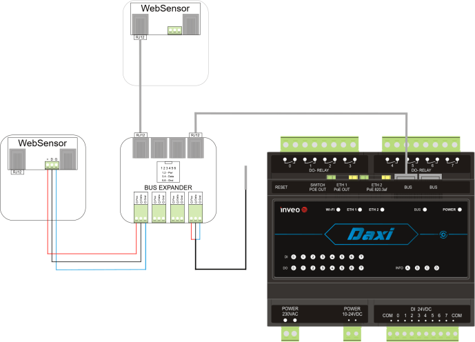Connect the BUS Expander with Daxi using a flat RJ12 cable to any BUS input. The sensors should be connected using a three-wire cable or to an RJ12 connector. Remember that Daxi supports a maximum of 16 sensors.