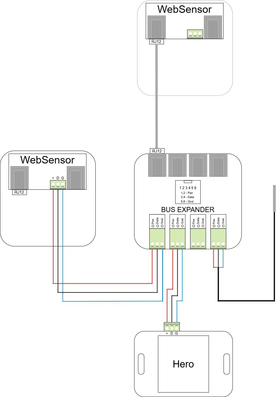 Connect the BUS Expander with the Hero Web Sensor using a three-wire cable to any 1-WIRE input.