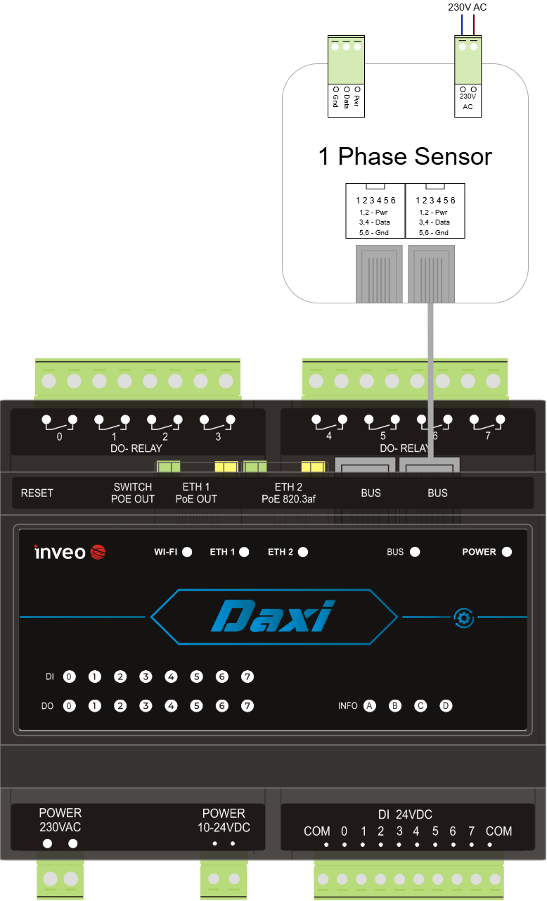 The WebSensor 1 Phase is used to detect phase loss, allowing for reliable monitoring of power status in energy systems. It is compatible with IQIO PRO, IQIO Sens and Daxi devices. Thanks to the 3-wire input and two RJ12 connectors, the detector can serve the function of a splitter, facilitating easy system expansion. Additional sensors can be connected to the device (WebSensor), broadening the monitoring and infrastructure management possibilities.