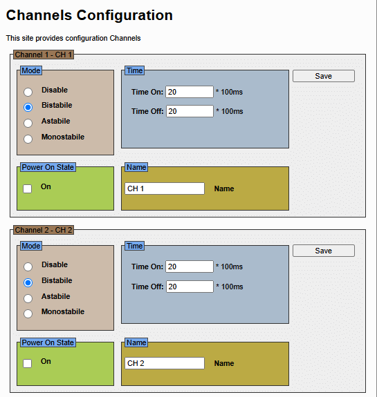 - Astabile – Tryb astabilny (czas załączenia oraz wyłączenia określany parametrami Time On i Time Off),
