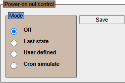 W oknie Power-on out control można zdefiniować, jak mają zostać ustawione wyjścia po zaniku i powrocie zasilania: