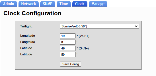 - Clock – Ustawienia współrzędnych geograficznych i trybu pracy zegara astronomicznego,