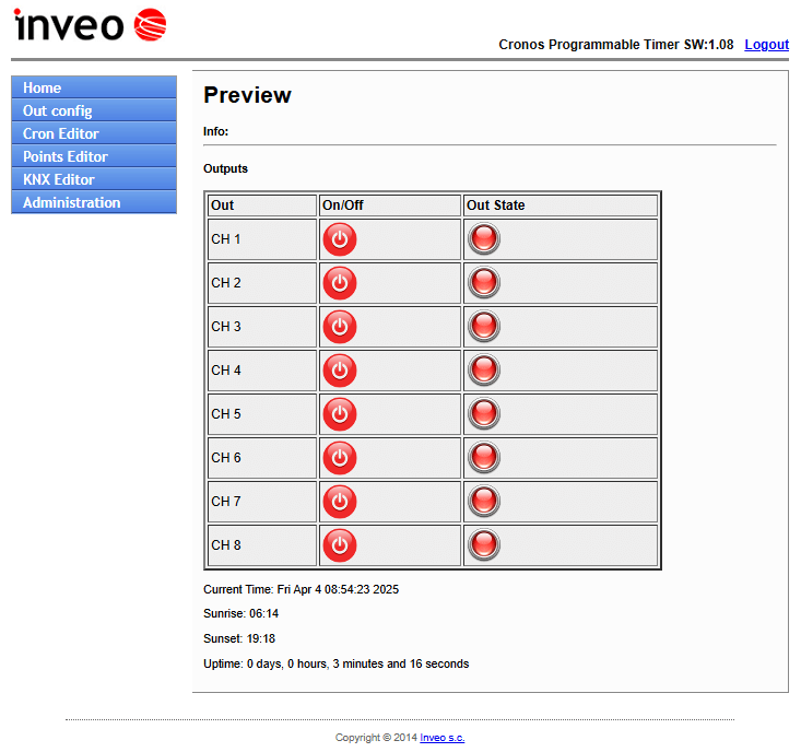 Po poprawnym zalogowaniu się do urządzenia użytkownik może sprawdzić aktualny stan wyjść oraz status urządzenia.