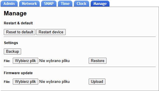 - Manage – Zmiana oprogramowania oraz reset urządzenia.