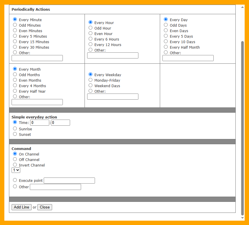 - Cron simulate – Po powrocie zasilania wyjścia są ustawiane na taki stan jaki by występował, gdyby sterownik cały czas działał.