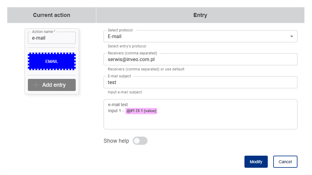 Poniżej przedstawiona jest tabela zawierająca przykładowe wewnętrzne zmienne, które umożliwiają przekazywanie danych związanych z działaniem urządzenia. Zmienne te znajdują zastosowania w powiadomieniach mailowych, SMS-owych, HTTP Client itp.