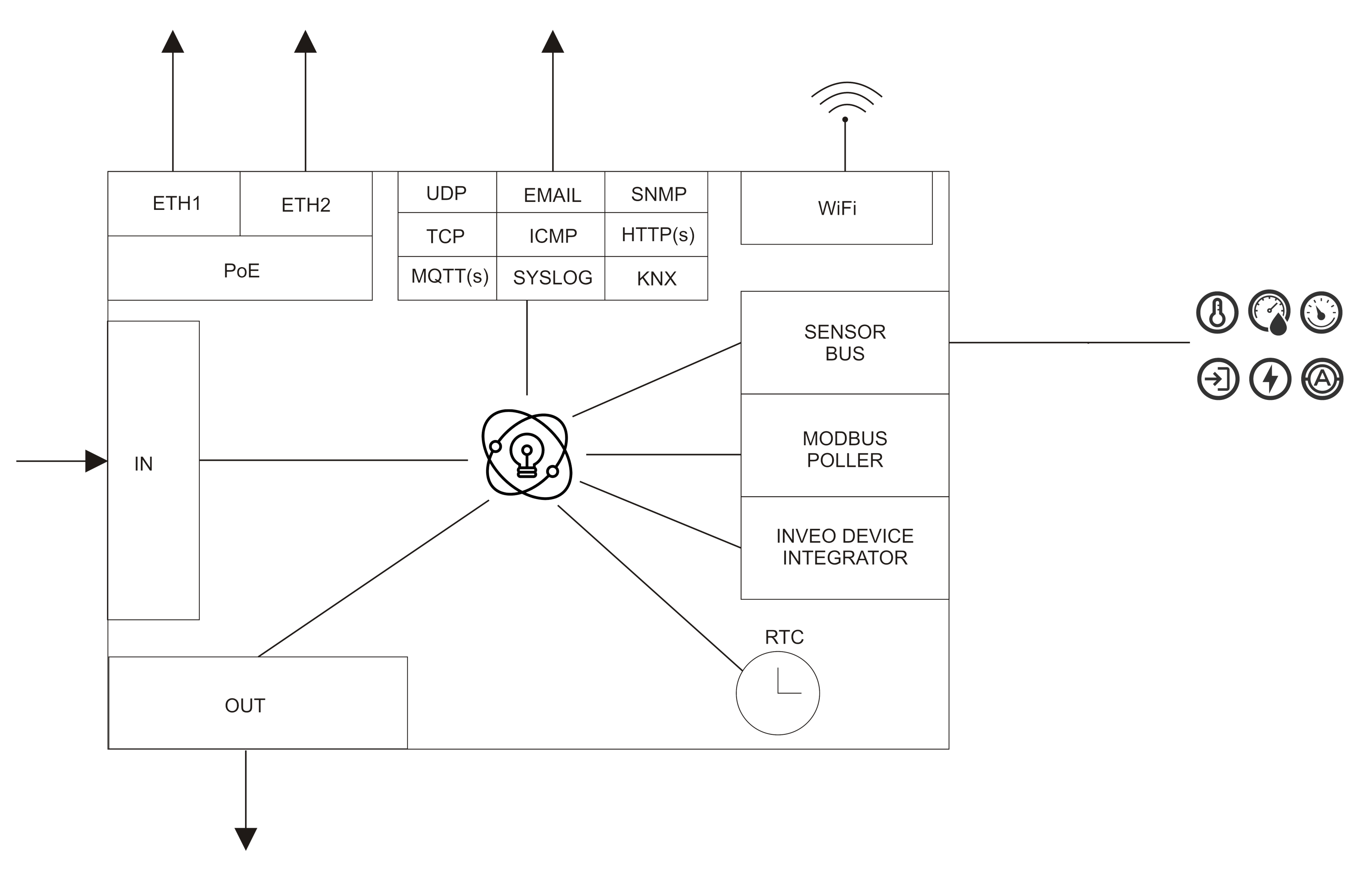 | Magistrala | 1-wire – kabel płaski RJ12 Obsługa do 16 czujników Dedykowane czujniki: temperatura, wilgotność, ciśnienie wody, ciśnienie powietrza, analogowy napięciowy, analogowy prądowy, gazy CO, CO₂, NOₓ |