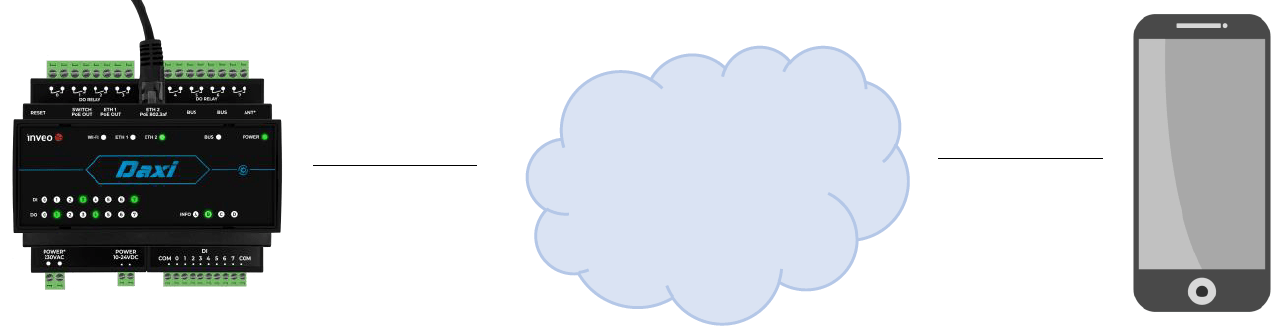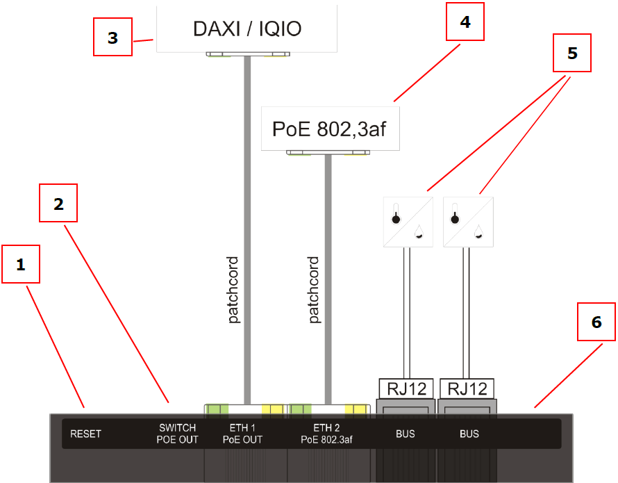 *Porty ETH1 i ETH2 są portami switcha, gdzie port ETH2 umożliwia zasilanie urządzenia Daxi za pomocą PoE 802.3af. W przypadku zasilania Daxi przez port ETH2 za pomocą PoE, port ETH1 staje się dostępny do zasilania kolejnego urządzenia. Jest to możliwe poprzez przełączenie switcha 2, co umożliwia przekazywanie zasilania PoE dalej. W takim systemie Daisy chain połączone mogą być maksymalnie dwa urządzenia (np. Daxi + Daxi).