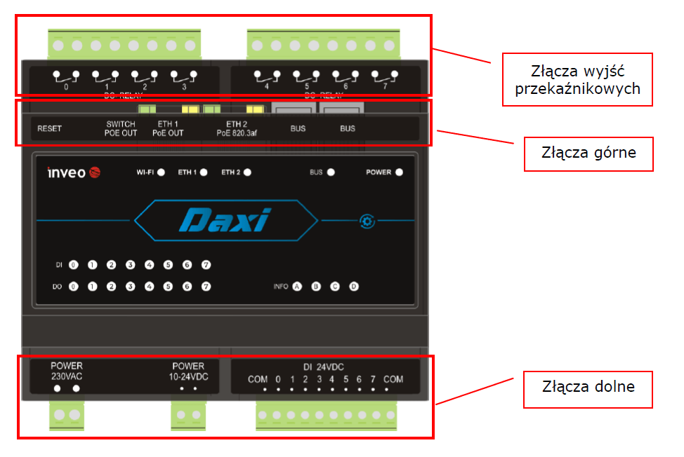 Złącza dolne – Umożliwiają podłączenie obsługiwanych wejść oraz zasilania modułu Daxi (10-24V DC oraz opcjonalnie 230V AC):