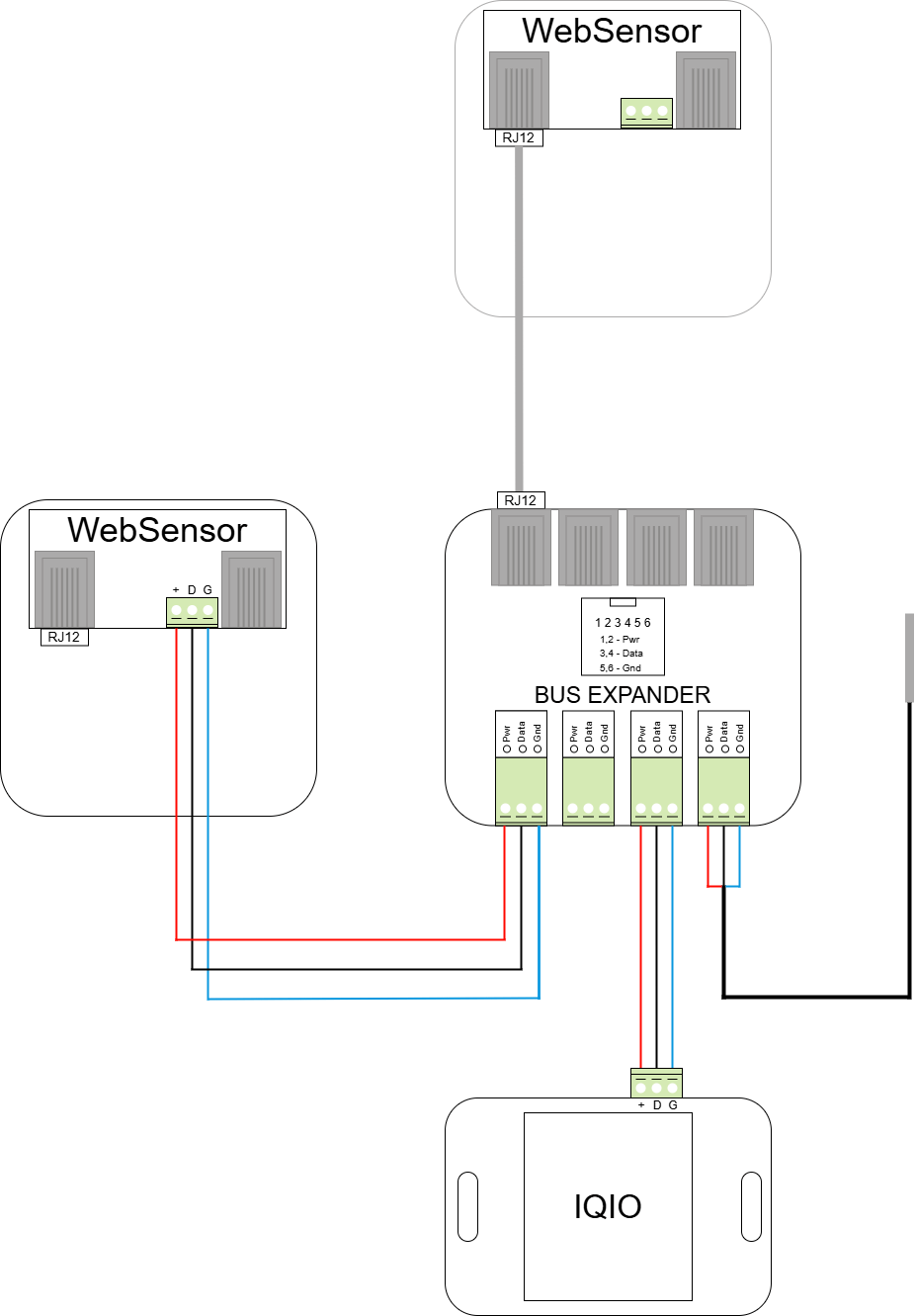 Należy podpiąć czujniki za pomocą kabla trójżyłowego, lub złącza RJ12. Należy pamiętać, że urządzenie IQIO PRO domyślnie obsługuje maksymalnie 6 czujników, a IQIO Sens – 2.
