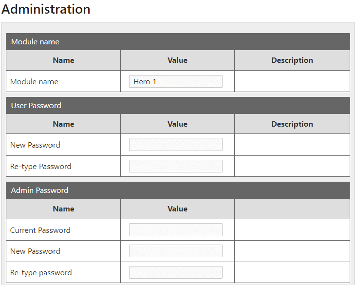 W sekcji Menu / Administration znajdują się opcje konfiguracji modułu HERO. Poniżej opisano dostępne ustawienia: