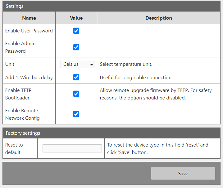 - Unit – Zmiana jednostki czujnika temperatury (stopnie Celsiusza na Fahrenheit),