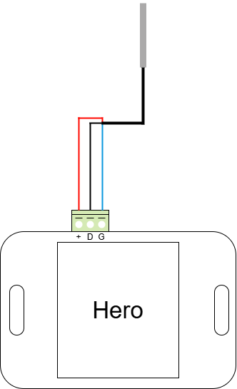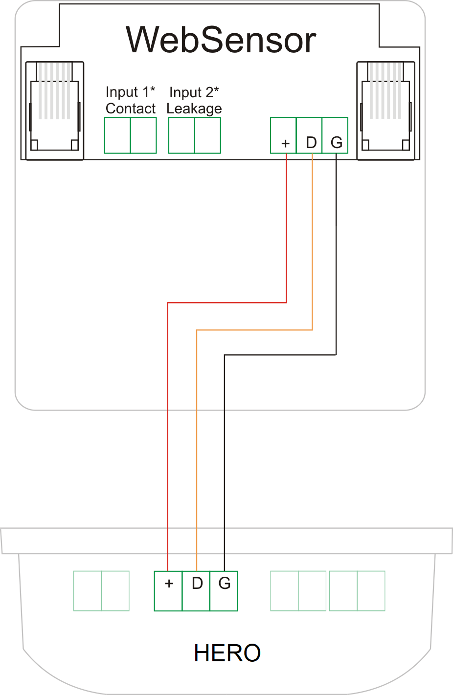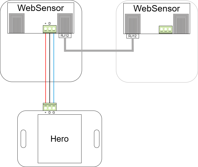 1. Podłącz czujnik WebSensor Combo do urządzenia Hero przy pomocy przewodu trójżyłowego lub płaskiego (z wykorzystaniem Adaptera RJ12) zgodnie z poniższym schematem: