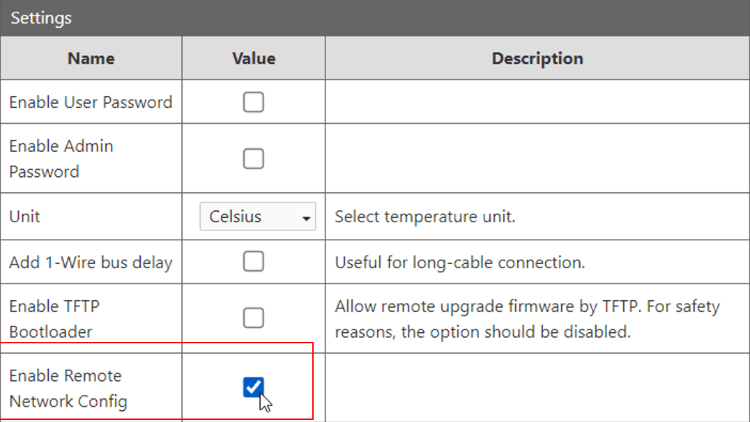 - W oknie Settings zaznacz opcję Enable Remote Network Config.