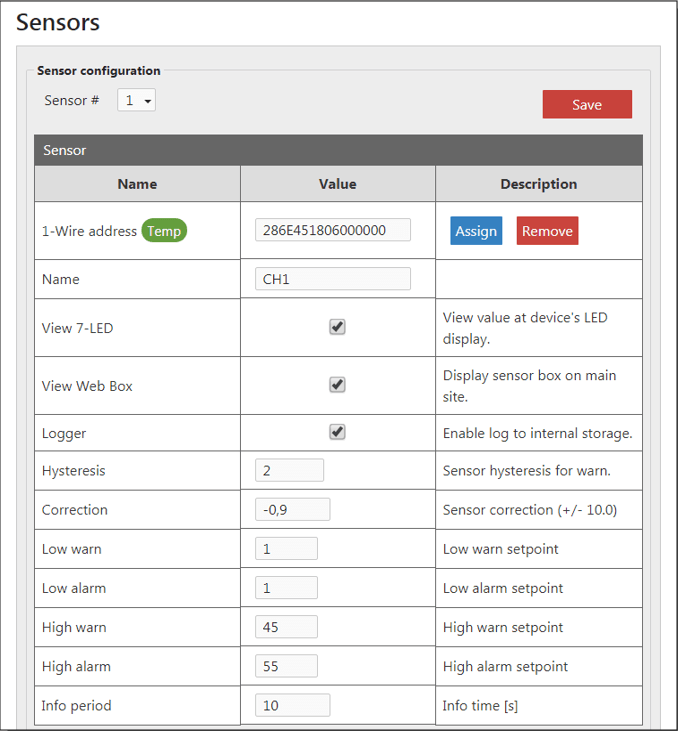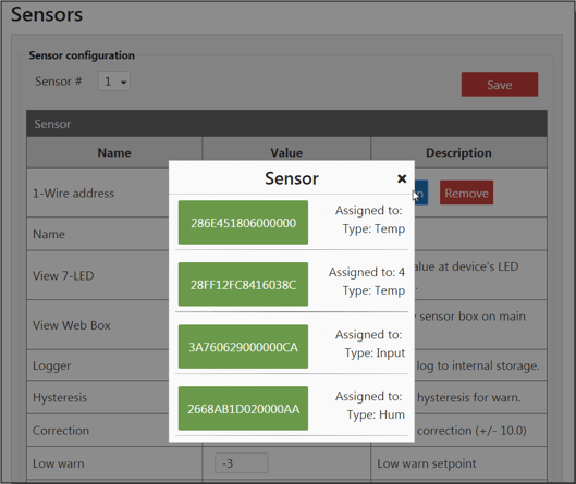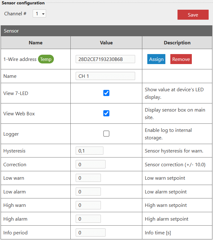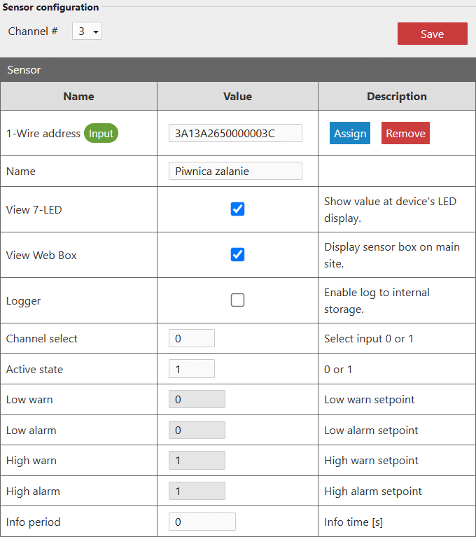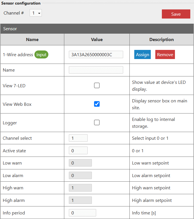 - Kliknij na adres czujnika, aby przypisać go do kanału. Obok 1-Wire address powinna pojawić się zielona ikona Input.