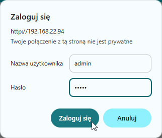 Po zaakceptowaniu ustawień przyciskiem OK należy uruchomić przeglądarkę internetową i wpisać adres: 192.168.111.15. (Domyślny użytkownik i hasło: admin/admin00).