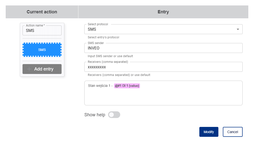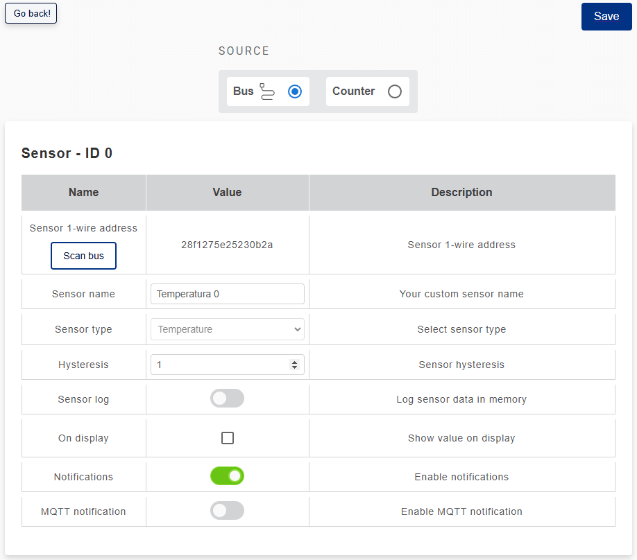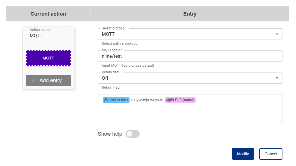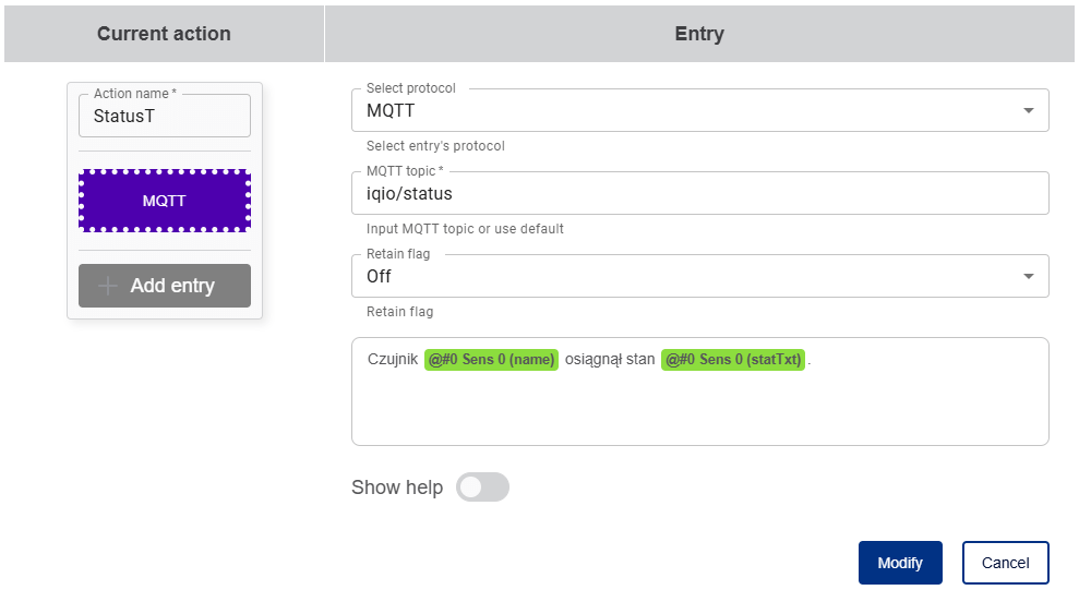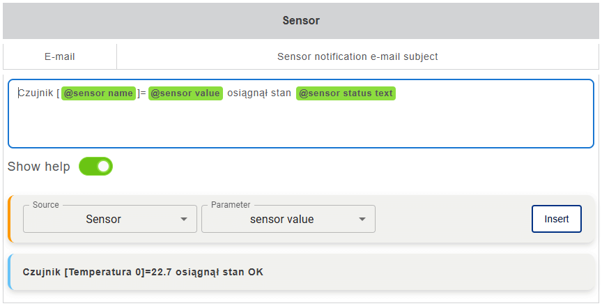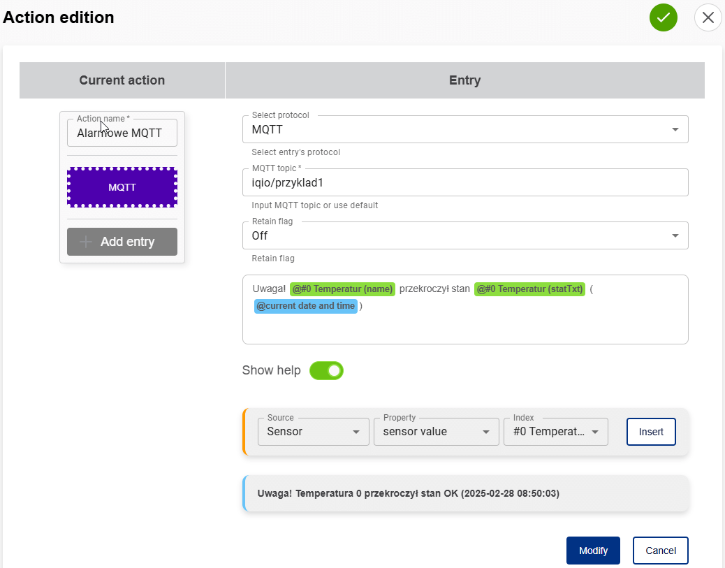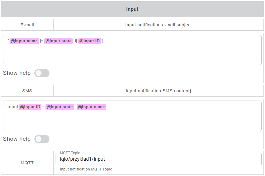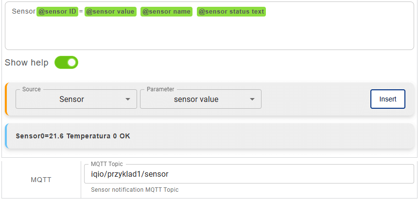 - W sekcjach Sensor i Input można zdefiniować treść i topic powiadomień.