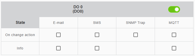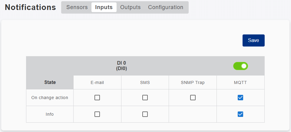 - W Notifications / Sensors/Inputs, załącz wybrane czujniki i zaznacz MQTT obok wybranych pól w tabeli,