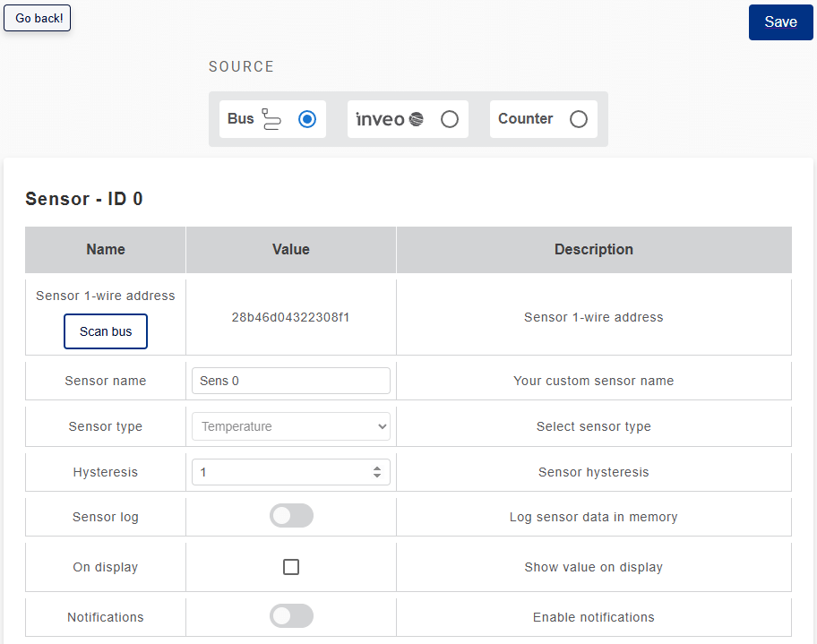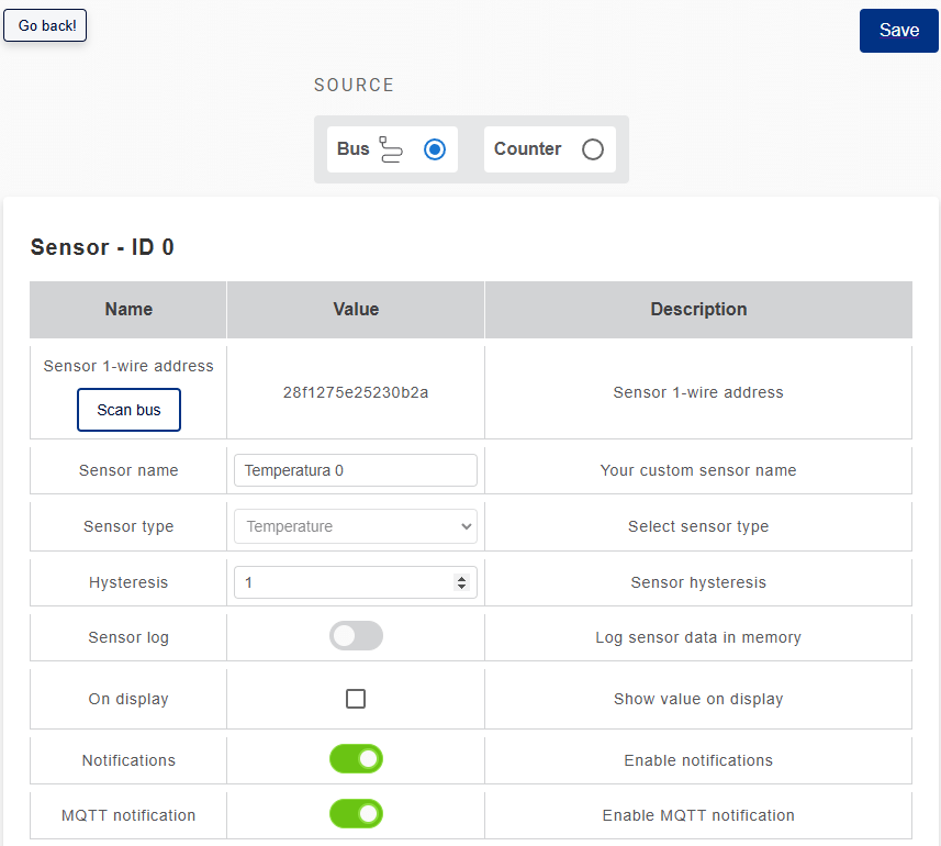 | Magistrala | 1-Wire – kabel 3-żyłowy lub kabel płaski RJ12 przy zastosowaniu adaptera Obsługa do 6 czujników Dedykowane czujniki: temperatura, wilgotność, ciśnienie wody, ciśnienie powietrza, analogowy napięciowy, analogowy prądowy, gazy CO, CO₂, NOₓ |