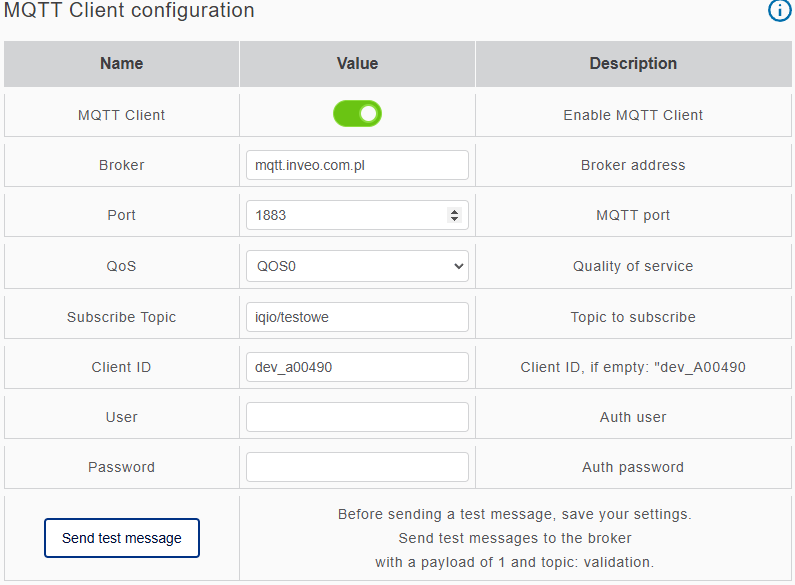 - iqio/status = ... – W tym temacie publikowane będą wiadomości systemowe dotyczące przekroczenia progów ostrzeżeń/alarmowych,