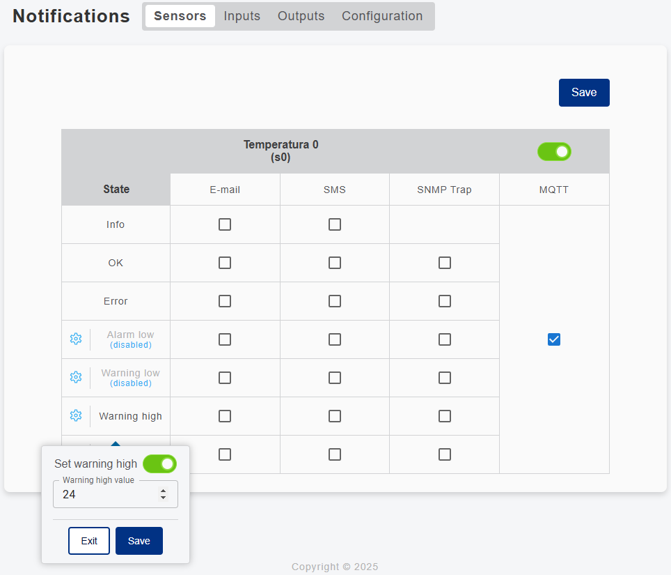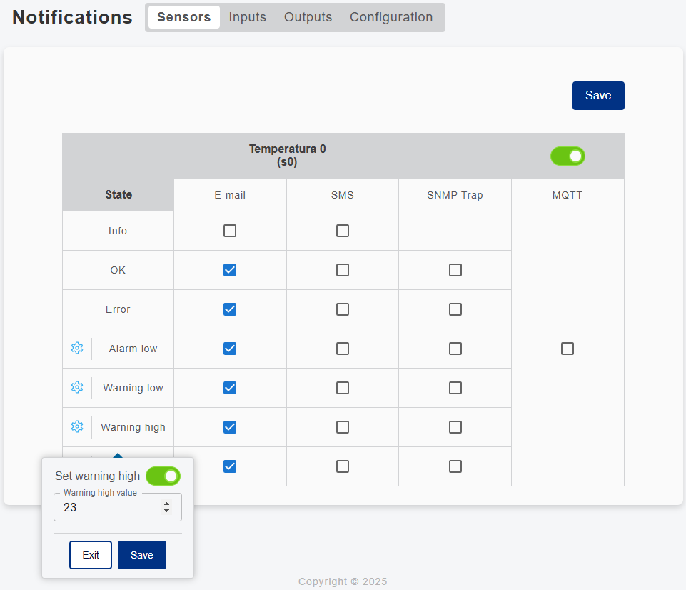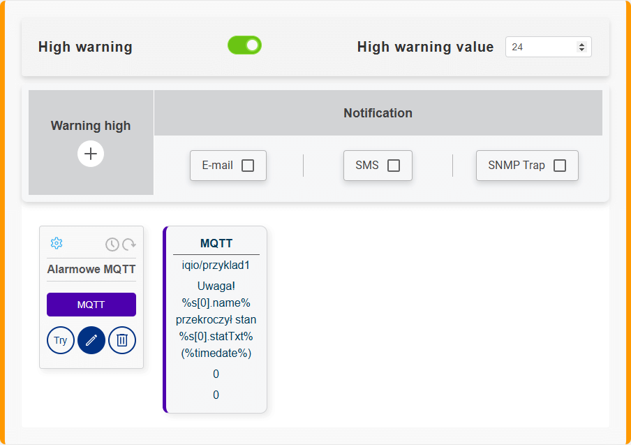 - W oknie konfiguracyjnym czujnika, aktywuj wybrane ustawienia powiadomień (np. high warning i high alarm), przypisz akcję i wprowadź wartość, która ją wywoła,