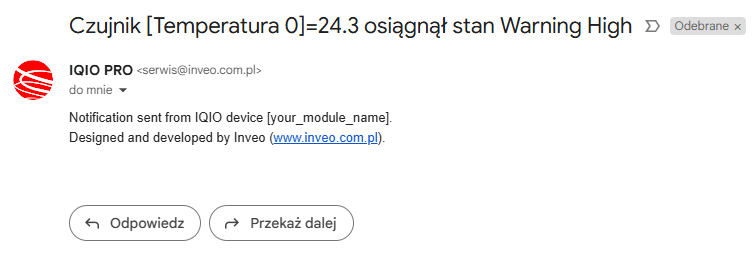 Jeśli konfiguracja powiodła się, wszyscy zadeklarowani odbiorcy otrzymają wiadomość e-mail w sytuacji przekroczenia progu ostrzeżenia/alarmowego.