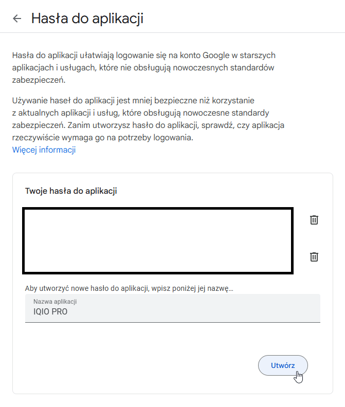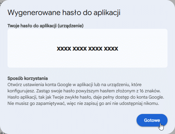 - Pojawi się okno z wygenerowanym hasłem do aplikacji. Skopiuj je i wklej do pola Password w panelu konfiguracyjnym IQIO: