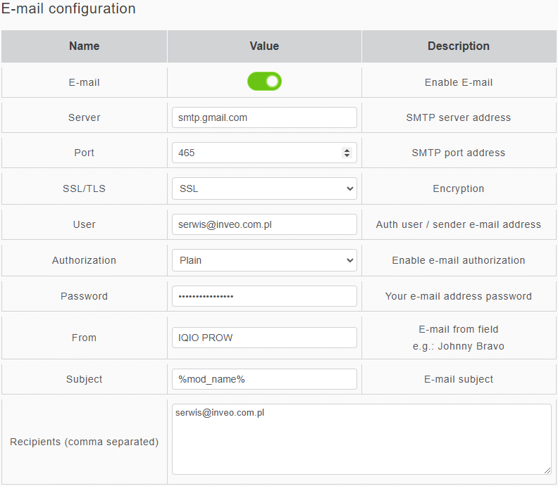 Cel: Powiadamianie o przekroczeniu progów ostrzeżeń/alarmowych, stanu normalizacji i błędów w formie wiadomości e-mail.