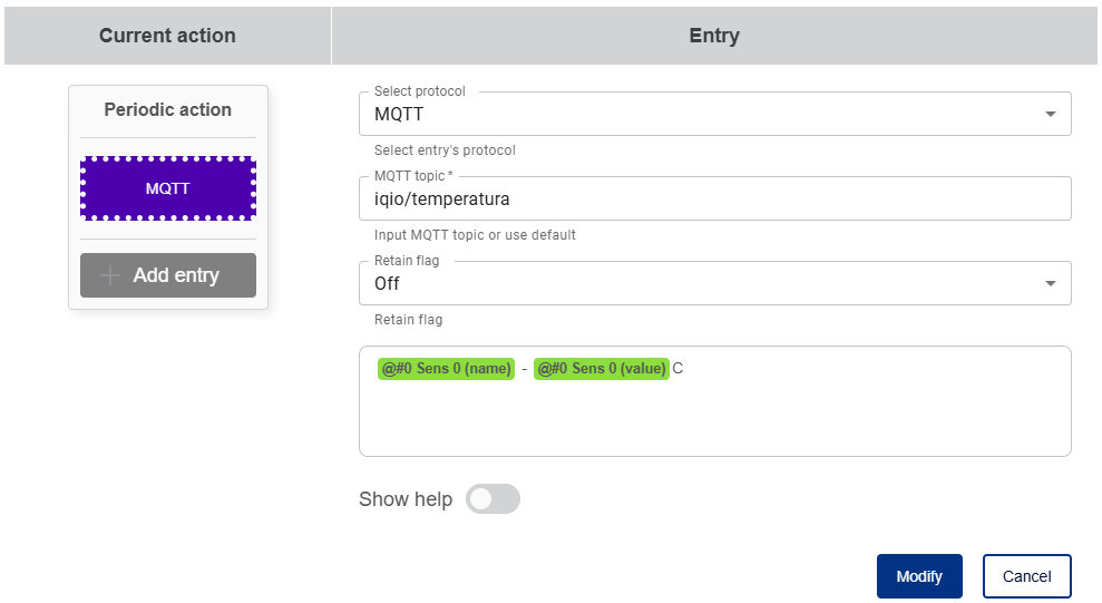 - W zakładce Actions / Periodic utwórz akcję, która będzie informowała o wartości zmierzonej czujnika nr 1 (temperatura):