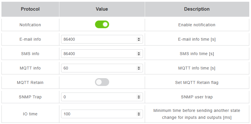- W zakładce Notifications / Configuration, załącz opcję Notification. W razie potrzeby zmień zawartość pók MQTT info i/lub MQTT Retain,