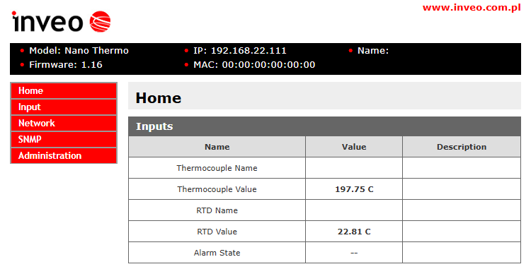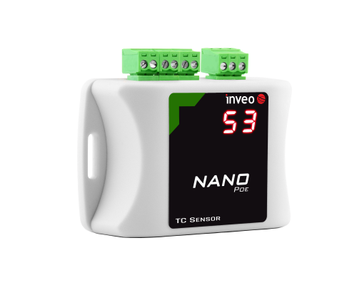 Urządzenie Nano TC Sensor PoE przekazuje poprzez sieć LAN pomiary temperatury, które są dokonywane za pomocą termopary, zapewniając łatwy dostęp do wyników pomiarów dzięki wbudowanej stronie WWW oraz różnym protokołom, takim jak HTTP GET, Modbus TCP, SNMP i MQTT, oraz umożliwiając komunikację z użyciem portu RS485 i protokołu Modbus RTU. Dodatkowo posiada zdolność do wysyłania powiadomień o przekroczeniu określonych wartości do innych modułów firmy Inveo, co może skutkować, na przykład, zdalnym załączeniem przekaźnika.