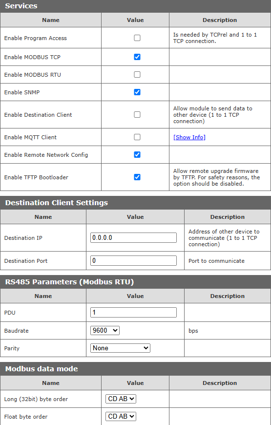 | Komunikacja | Port Ethernet 10Mbps Half Duplex, RJ45 Port RS485, Modbus RTU Prędkość transmisji: 1200, 2400, 4800, 9600, 19200, 38400, 57600bps Parzystość: None, Odd, Even, Mark, Space, 2 Stops |