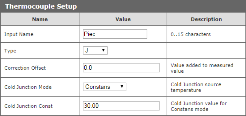 | Wejście | 1 wejście służące do podłączenia czujnika PT100 lub PT1000 w celu uzyskania temperatury odniesienia (temperatura odniesienia może być ustawiona programowo jako wartość stała) 1 wejście przeznaczone do podłączenia termopary typu: E, J, K, N, T, B, R, S Częstotliwość pomiaru: 4Hz Rozdzielczość przetwornika: 17 bit |