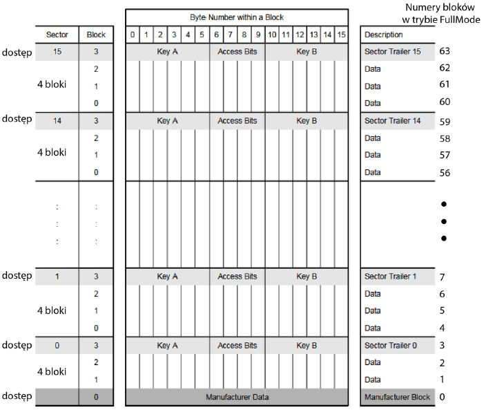 Na końcu każdego sektora znajduje się blok Sector Trailer. Zawiera on klucze dostępu oraz bity konfiguracyjne dla bloku danych: