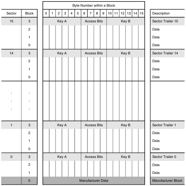 Na rysunku poniżej przedstawiona jest struktura 1k tagu Mifare. (źródło: NXP Semiconductor MF1S503x pdf):
