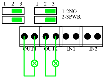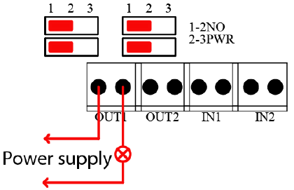 - Tryb Normally Open – Zworki ustawione w pozycji 1-2 (patrz rysunek poniżej). W tym trybie wymagane jest podłączenie zewnętrznego źródła zasilania.