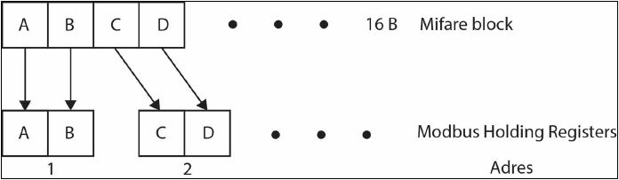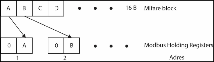 - Full mode – Pamięć odczytu i zapisu jest adresowana dokładnie tak, jak struktura pamięci tagów. By odczytać drugi bajt z pierwszego bloku danych należy odczytać 18 + przesunięcie bufora Modbus Register (1*16 + 2 = 18). Blok 0 z 15 sektora zaczyna się od 15(numer sektora) *4(blok w sektorze)*16(bajt w bloku) + przesunięcie bufora Modbus Register. Należy zwrócić uwagę, aby nie zapisać niechcianych danych do Sector Trailer, ponieważ może to zablokować dostęp do sektora.