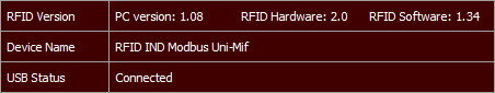 Pierwsza linijka programu wyświetla informacje o wersji programu konfiguracyjnego – PC version, wersji oprogramowania czytnika – RFID Software oraz wersji sprzętowej czytnika RFID Hardware.