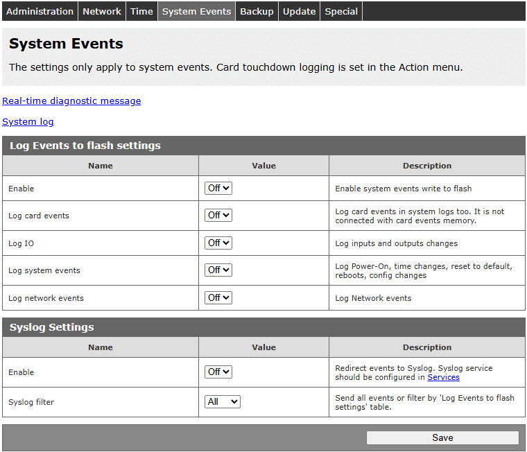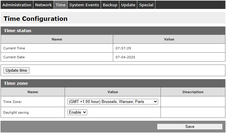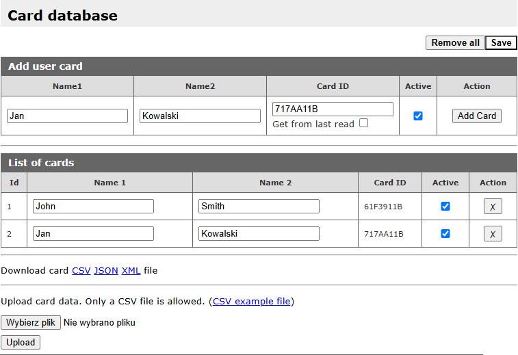Wszystkie dane konfiguracyjne mogą zostać zapisane do pliku. Użytkownik może utworzyć/wczytać plik backup’u na stronie Administration / Backup.