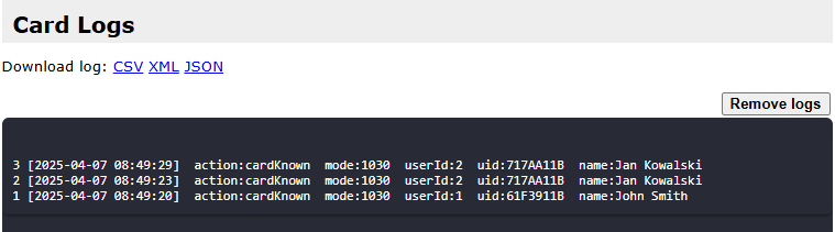| 1204 | W | Usunięcie najstarszych logów w liczbie przekazanej jako parametr |
