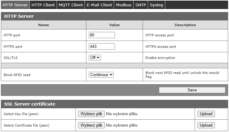 - Protokół HTTP/HTTPS w trybie serwer,