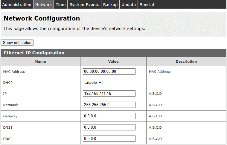 Aby dostosować ustawienia sieciowe urządzenia, należy przejść do zakładki Administration / Network. Tutaj możliwe jest skonfigurowanie parametrów LAN (oraz WLAN, jeśli dostępne) takich jak adres IP, maska podsieci, brama, DNS oraz inne specyficzne dla sieci opcje.