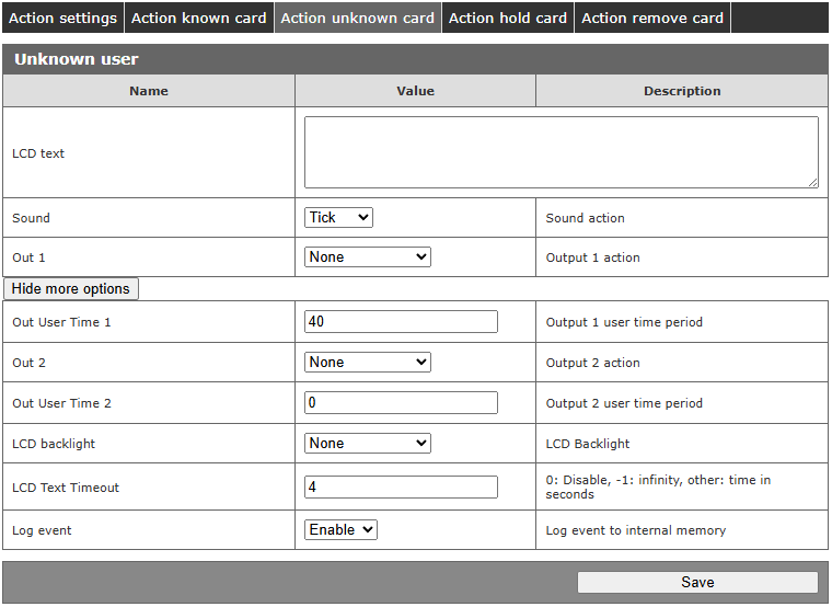 | Transpondery | RFID RCP2 występuje w następujących wersjach: Mif: Wersja obsługująca transpondery Mifare Classic® Uni: Obsługuje transpondery Unique EM4100, EM4102 HT2: Transpondery HITAG 2 Ico: Wersja dedykowana dla transponderów ICODE® Odległość odczytu tagu: do 8cm Wbudowana pamięć: 5000 tagów, 30 000 zdarzeń |